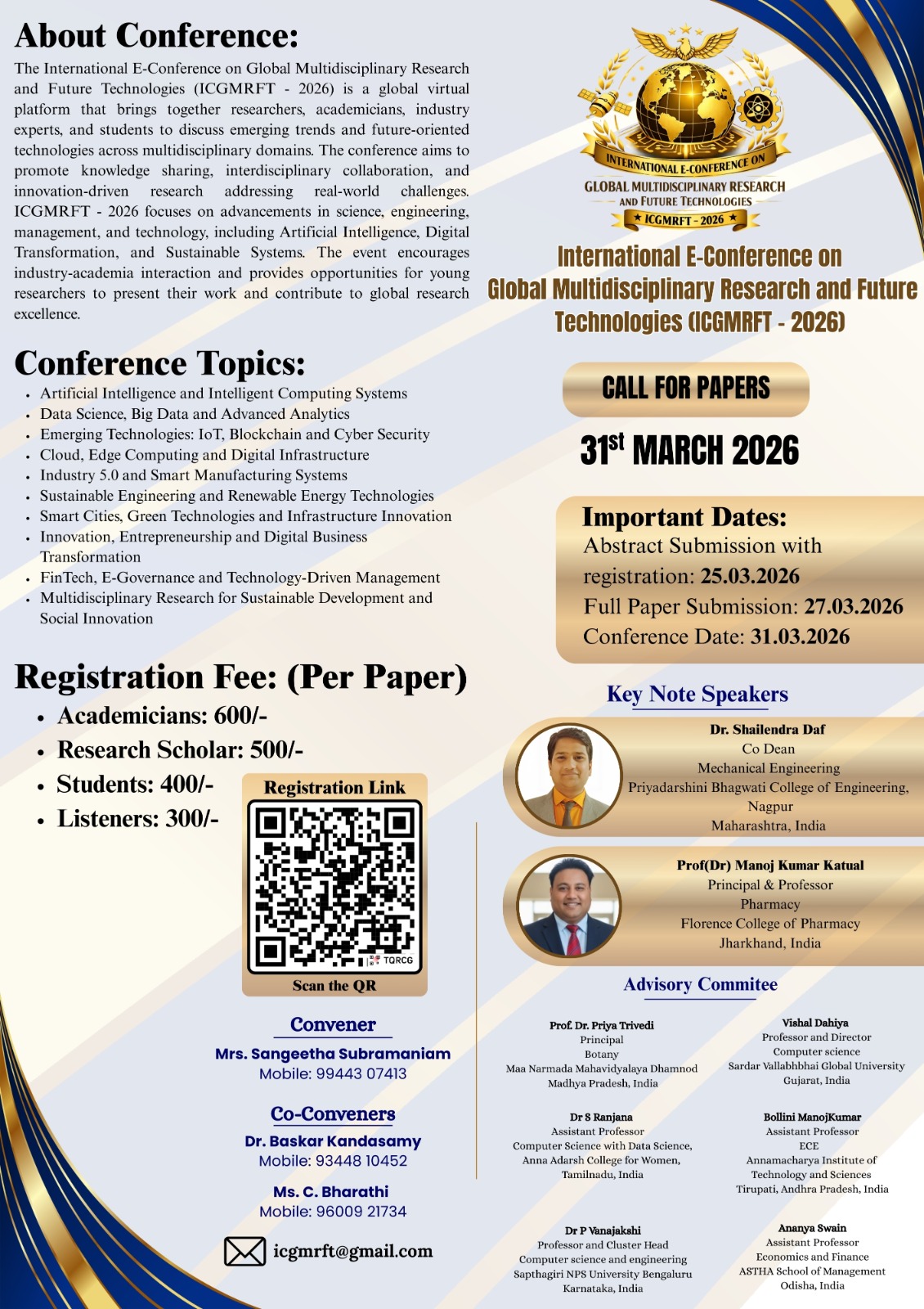 A global virtual platform bringing together researchers, academicians, and industry experts to discuss emerging trends. The conference aims to promote knowledge sharing and innovation-driven research addressing real-world challenges across Artificial Intelligence, Digital Transformation, and Sustainable Systems.
